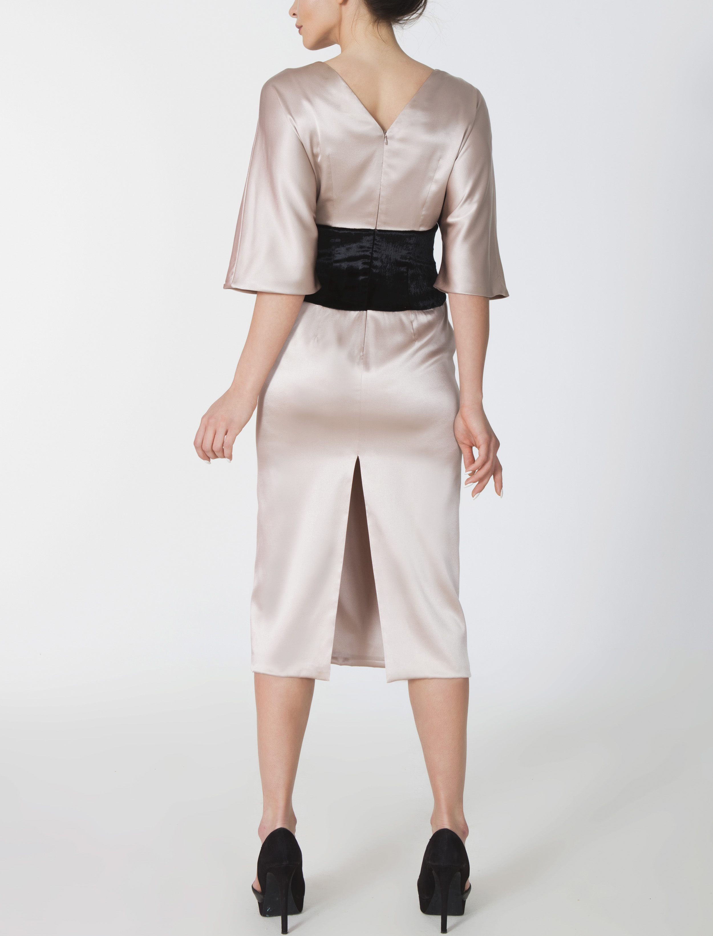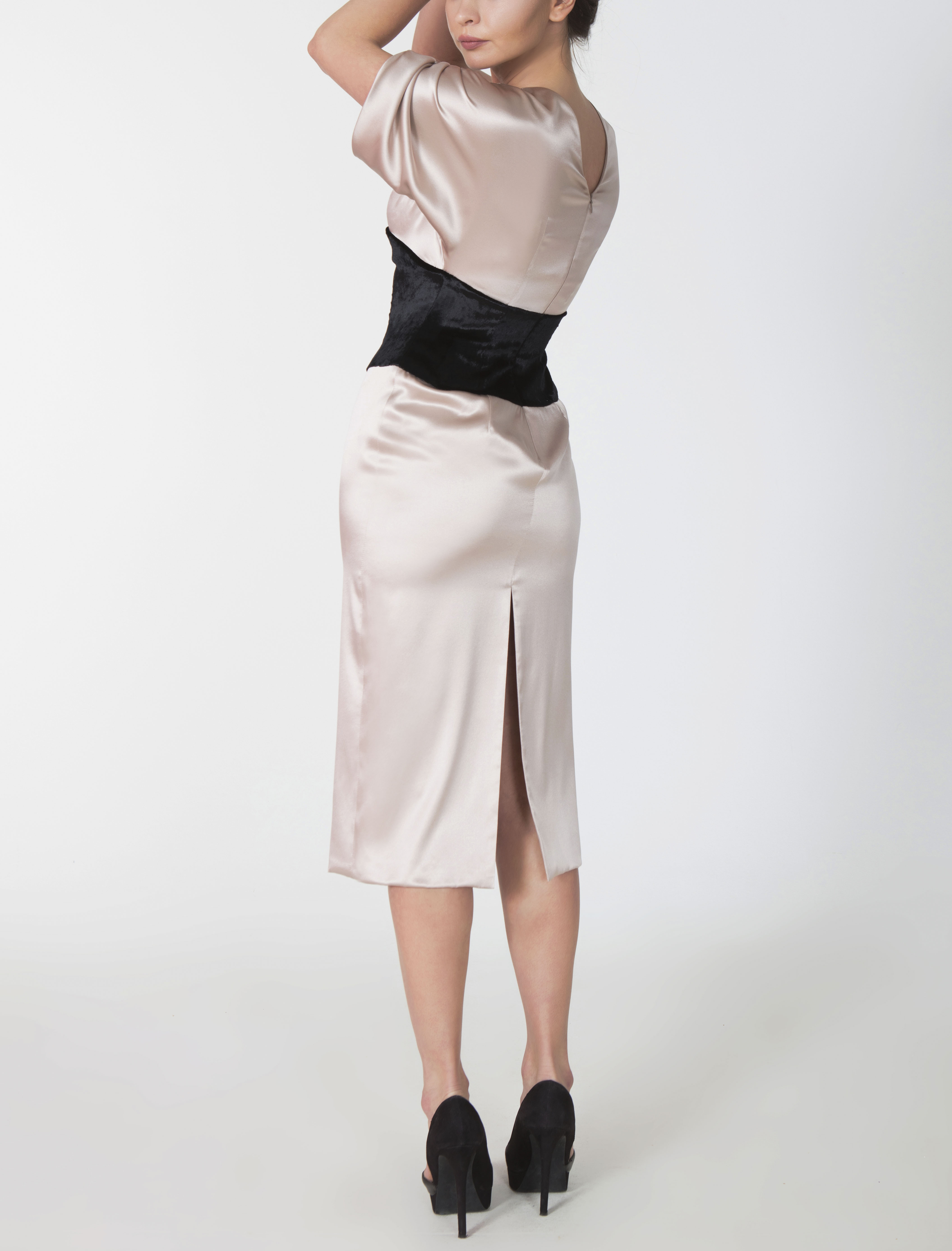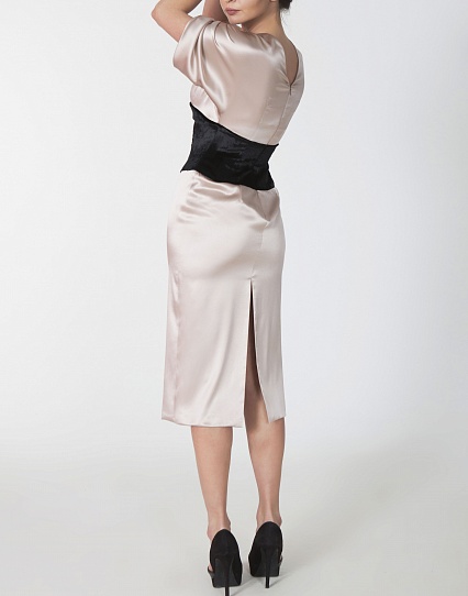 Платье прилегающего силуэта, удлиненное (на рост 170 длина ниже колена), зауженное к низу. Широкие рукава, немного ниже локтя. Выполнено из нежного натурального шелка, корсет из черного бархата.